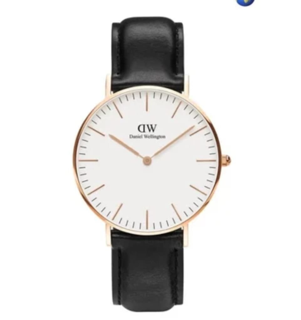 This timepiece features a minimalist, sleek design, typical of the brand. It has an all-black aesthetic, with a dark watch case, a black dial, and a black leather strap. The dial uses simple index hour markers (lines) instead of numerals, contributing to its clean look. The hands appear to be a contrasting lighter shade, possibly silver or gunmetal, which enhances readability against the dark background. It’s a classic, versatile watch often favored for its slim profile and ability to be dressed up or down, fitting both formal and casual settings. Daniel Wellington watches are generally quartz-powered and known for their easily interchangeable straps.