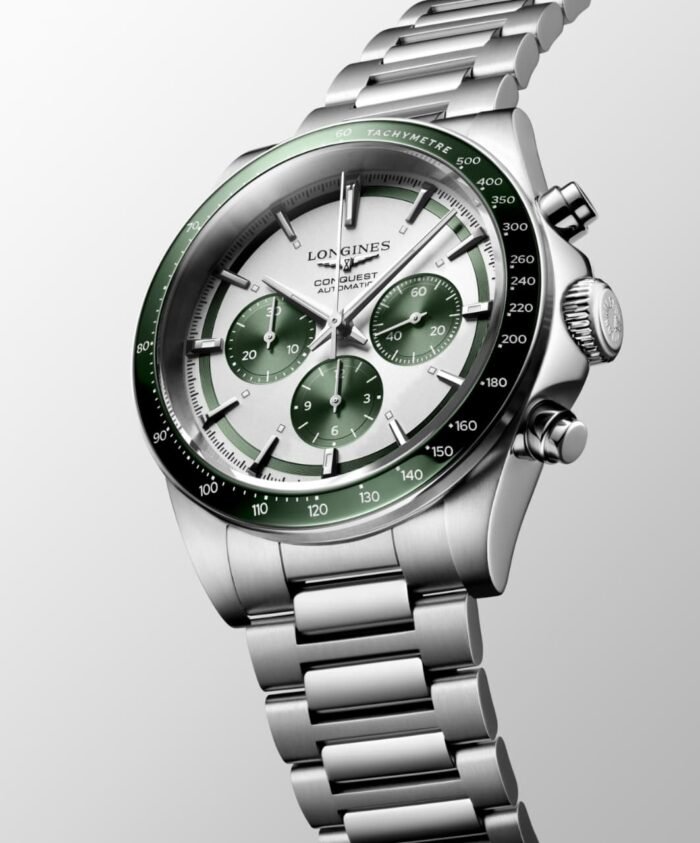 The Longines Conquest Chrono Ski Edition Ref. L38354026 is a sporty, limited-edition automatic chronograph for 2025, celebrating the FIS Alpine World Ski Championships in Saalbach.1 Its robust 42mm stainless steel case features a black ceramic tachymeter bezel and 100m water resistance.2 The striking anthracite dial has a vertical satin finish, contrasting with black snailed sub-dials and bold red accents on the chronograph hands for legibility.3 It is powered by the exclusive magnetic-resistant Calibre L898.5 with a 59-hour power reserve.4 The caseback is engraved with a commemorative skier emblem.5 This timepiece offers an elegant blend of horological performance and alpine sports heritage.6