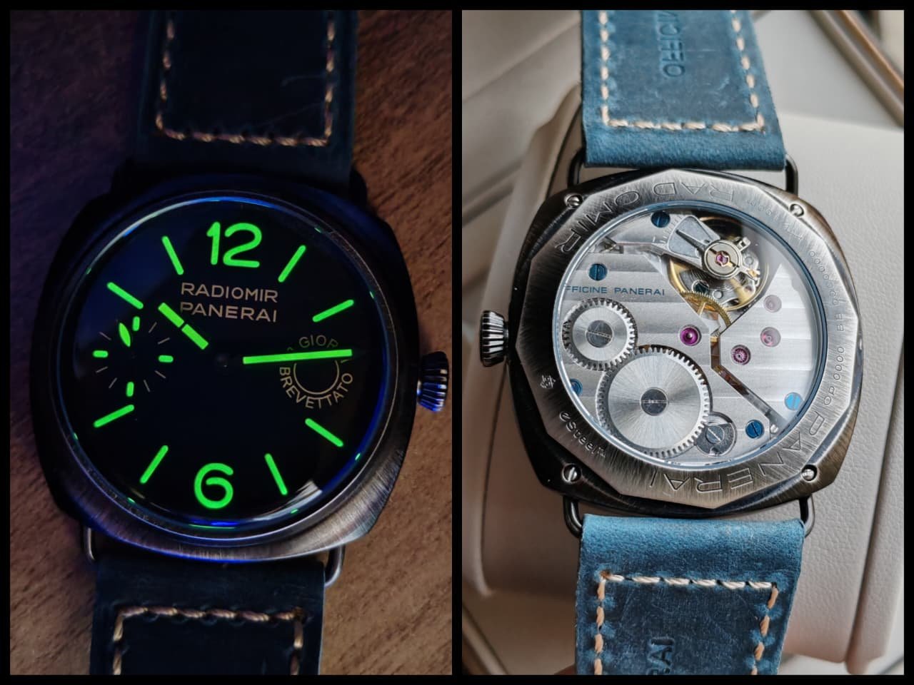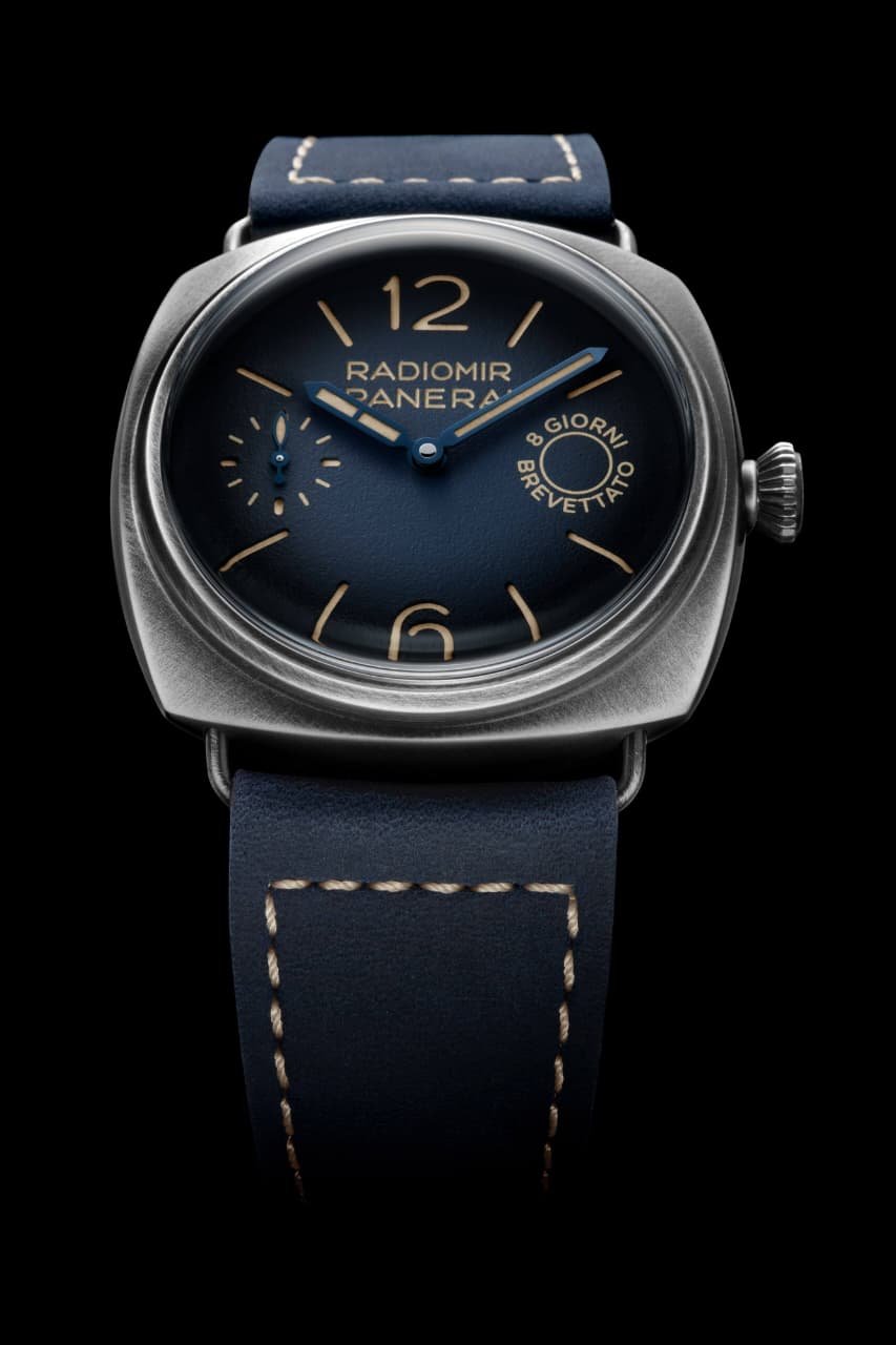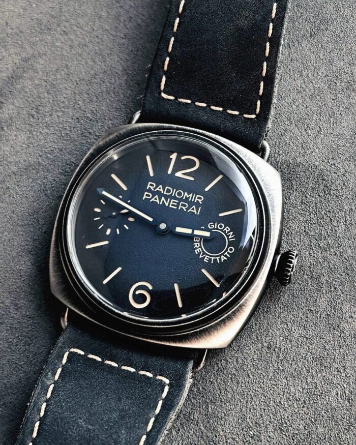 The Panerai Radiomir Otto Giorni Brunito is a vintage-inspired piece paying tribute to the original 1930s model. It features a 45mm cushion case made from Brunito eSteel—Panerai’s recycled steel given a unique hand-finished, burnished (aged/distressed) look.
