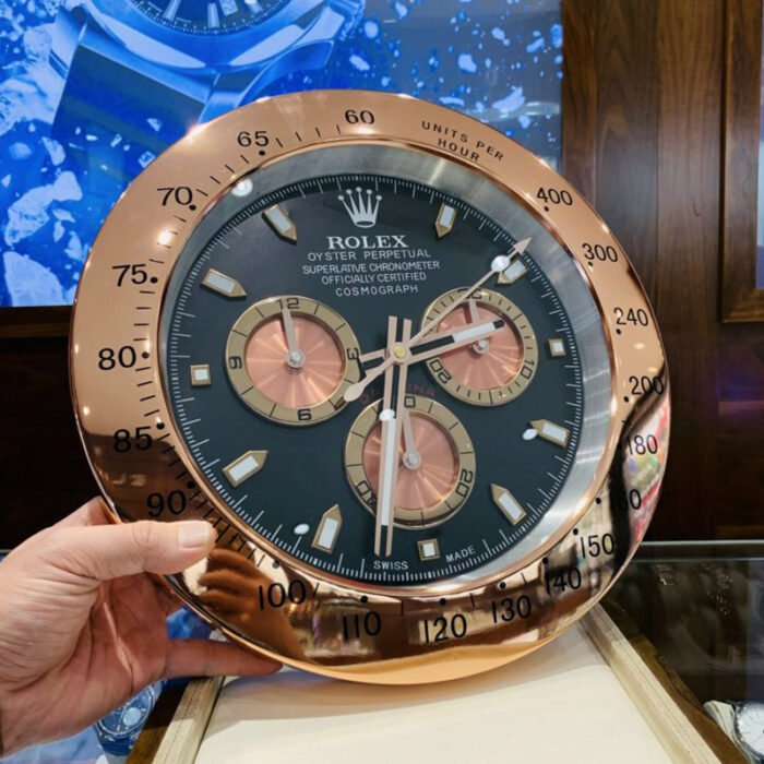 Elevate your space with this 13-inch, Rolex-inspired rose gold wall clock, a symbol of regal elegance perfect for royal homes and luxury hotels. Encased in a substantial stainless steel body (weighing 1.7 kg to 2 kg), it conveys true quality.